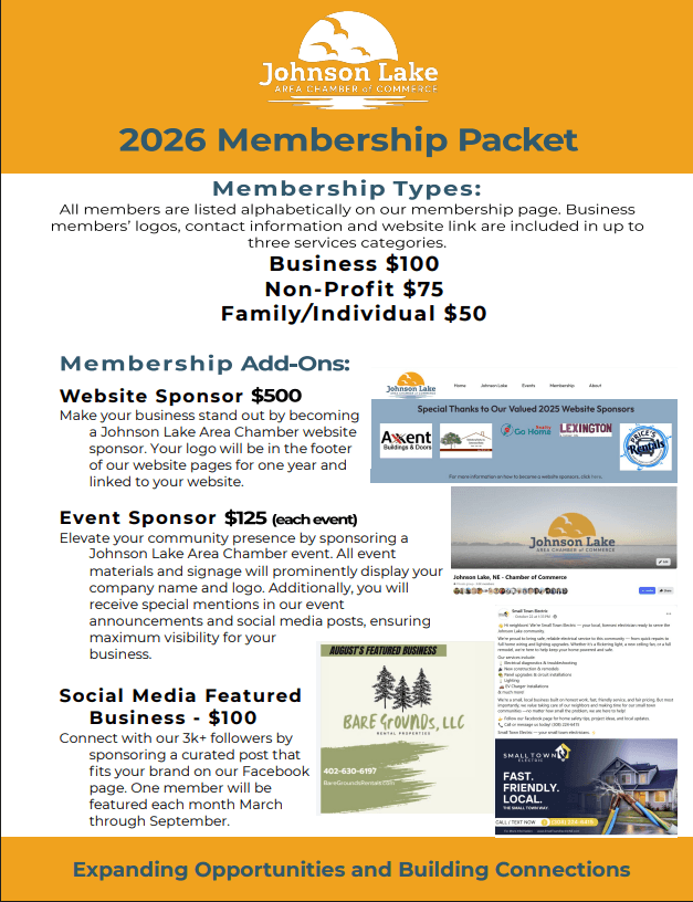 We invite you join us as a Johnson Lake Area Chamber member this year. Your support fuels everything we do from promoting local businesses and organizing community events to advocating for the future of our lake. When you invest in the Chamber, you’re investing in Johnson Lake.